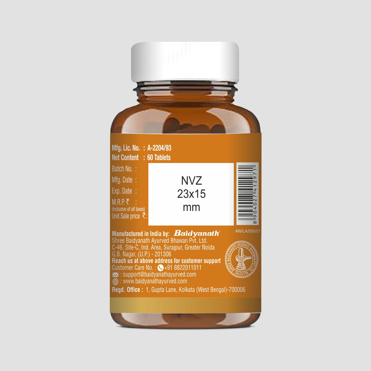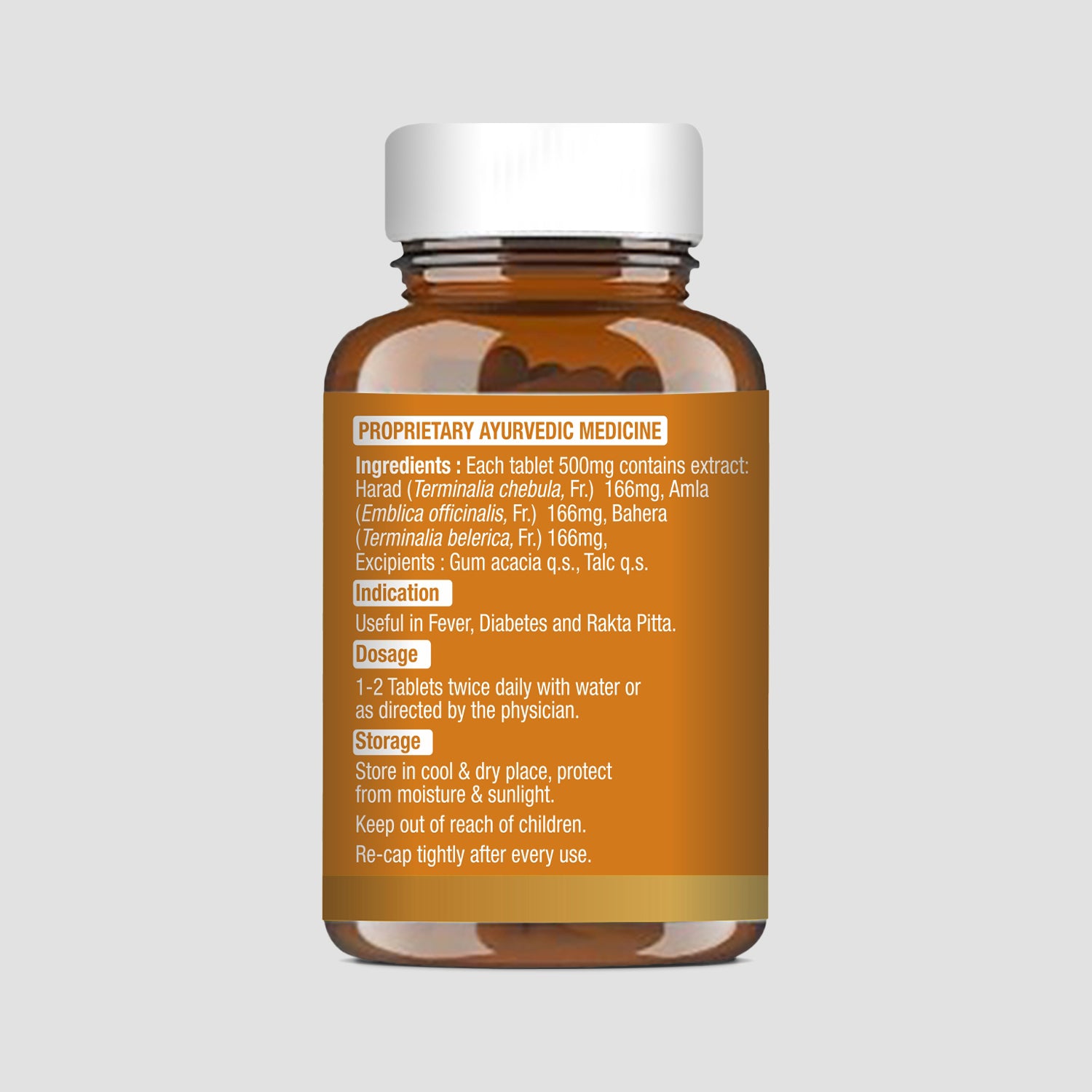 Baidyanath Triphala Tablets contain anti-inflammatory compounds beneficial for indigestion, diarrhea, and eye disorders. Made from Haritaki, Amla, and Bibhitaki, they balance the three doshas - Kapha, Vata, and Pitta. Rich in antioxidants and Vitamin C, these tablets support immunity and detoxification. They promote liver health by balancing Agni and Pitta doshas and aid in weight management by improving digestive fire and reducing Ama. Triphala also acts as a mild laxative, aiding in internal cleansing.