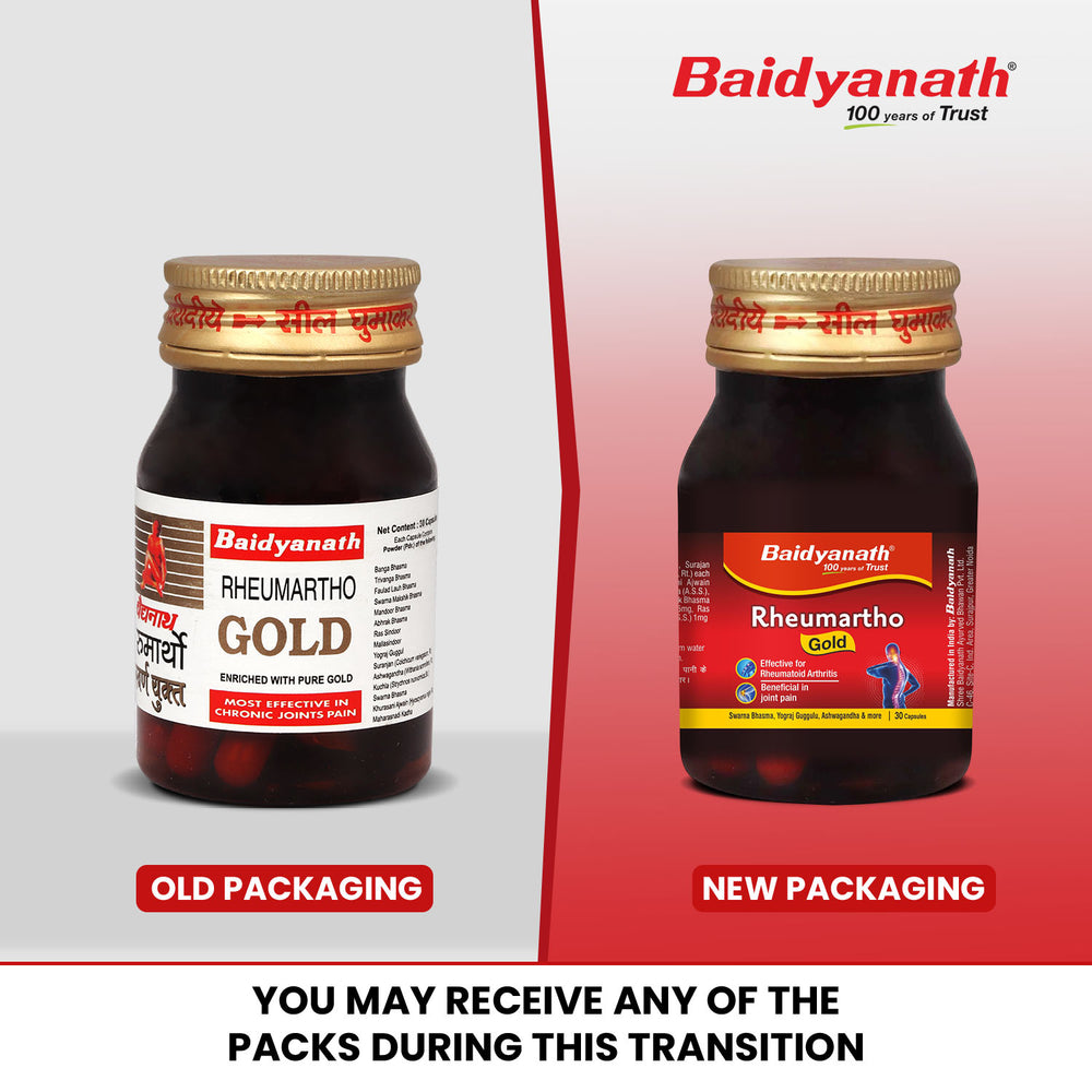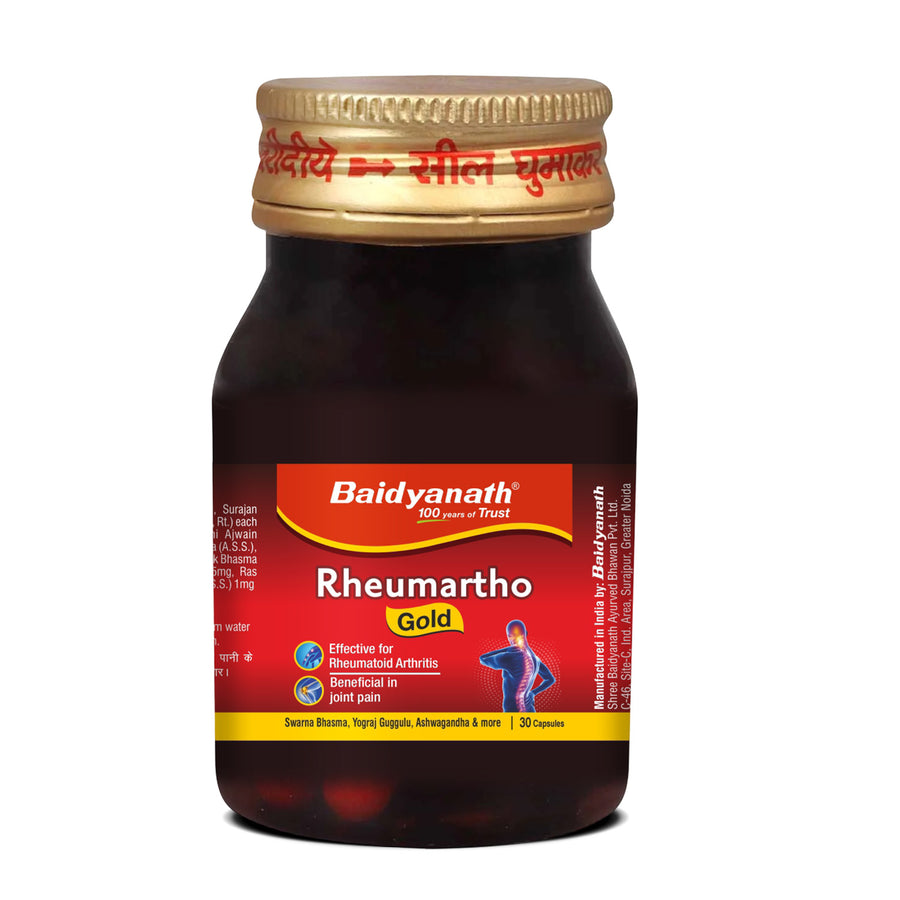 Baidyanath Rheumartho Gold Capsules are formulated using a blend of Ayurvedic ingredients known for their efficacy in joint health. This product combines the power of traditional herbs and Swarna Bhasma (Gold Bhasma), a revered Ayurvedic ingredient, to help alleviate joint pain and improve mobility. It supports the body’s natural ability to reduce inflammation, ensuring optimal joint function and comfort.