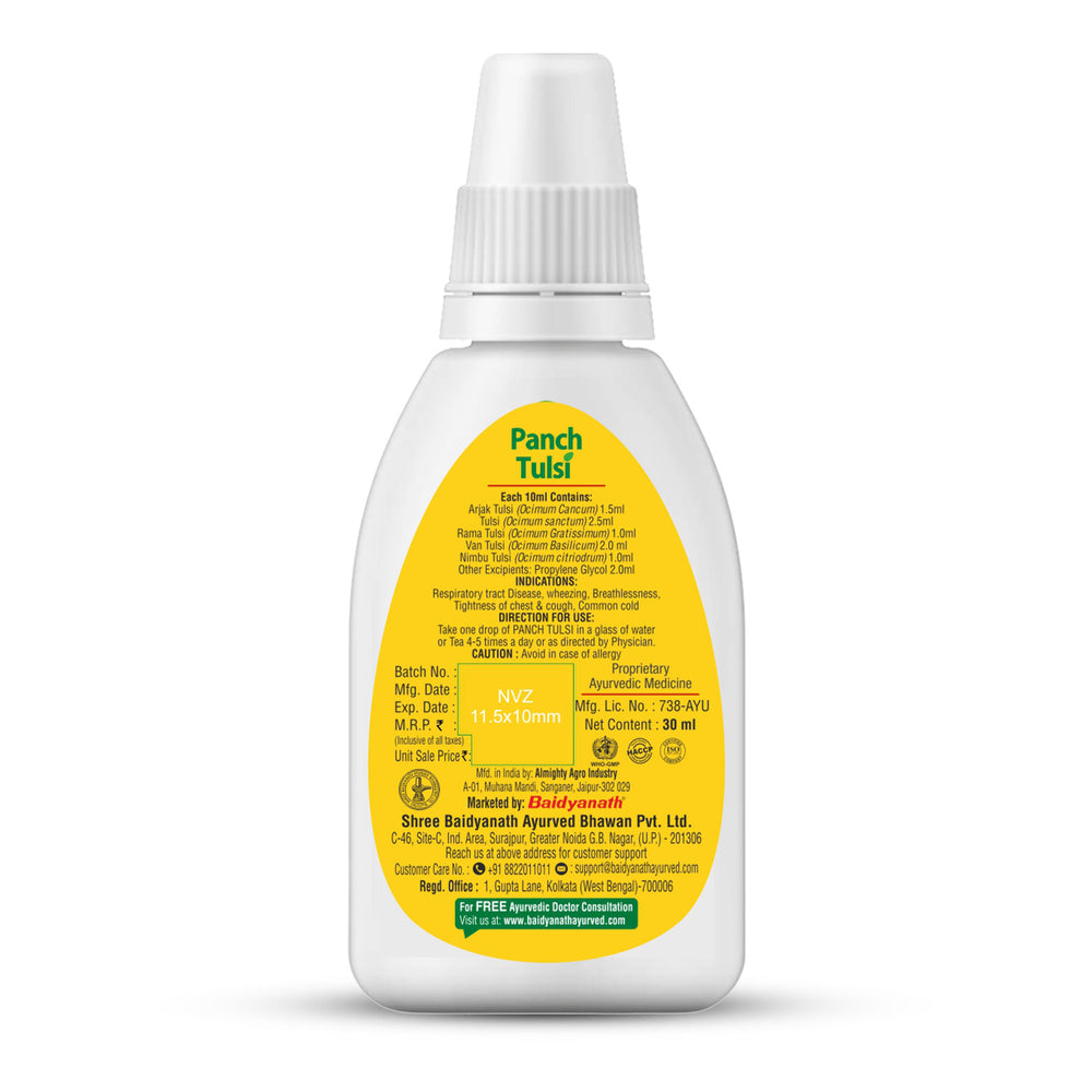 Helps Support Respiratory Health: Baidyanath Panch Tulsi Drops contains a blend of five types of tulsi, each known for supporting respiratory health. This formulation aids in maintaining clear airways, promoting easier breathing, and helping the body respond better to seasonal changes.